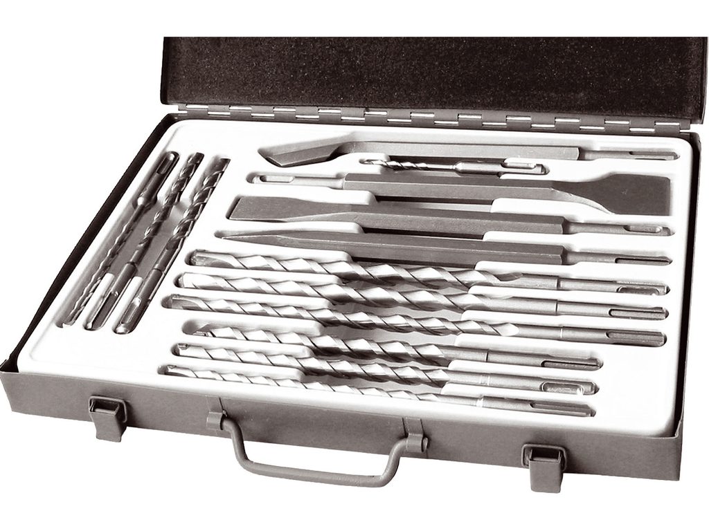 • doplňující parametr: sekáče 250mm: plochý 20 a 40mm, špičatý, drážkovací vrtáky: O 5x110mm, O 6-8-10x160mm, O 8-10-12x210mm, O 10-12-14x260mm, v kovové kazetě