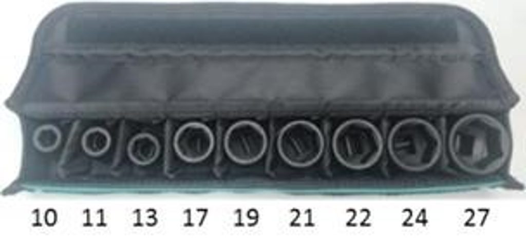 Sada obsahuje nástrčné klíče s upínáním čtyřhran 1/2" o průměru 10, 11, 13, 17, 19, 21, 22, 24 a 27 mm. Dodáváno v nylonovém pouzdře.